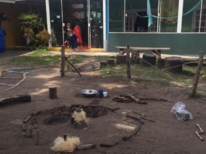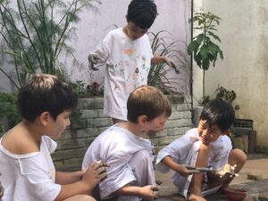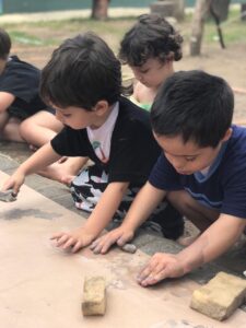 As crianças ouviram a risada da feiticeira e saíram para procurar pedaços de argila os espalhados pela escola que Kirikou havia deixado. Depois foram para a Paidéia e encontraram 3 ambientes com formas diferentes de explorar esse material.