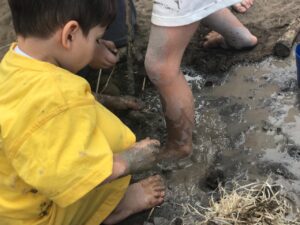 Foi uma festa! Os pequenos se entregaram a essa experiência e brincaram com a argila juntamente com vários materiais, terra, água, madeira e, claro muita lama!
